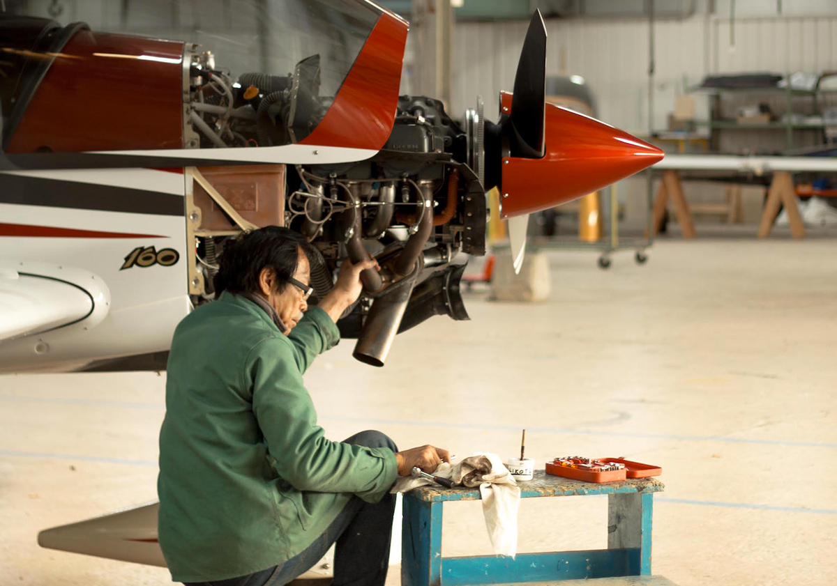 C’est en direction de cet atelier que toutes les pièces des autres ateliers convergent. Réunies par les mains expertes de nos artisans en puzzle aéronautique, elles y deviennent un DR401 ou un CAP10. Il arrive qu’une dizaine d’avions en cours de montage s’y trouvent en même temps, à divers degrés d’avancement.